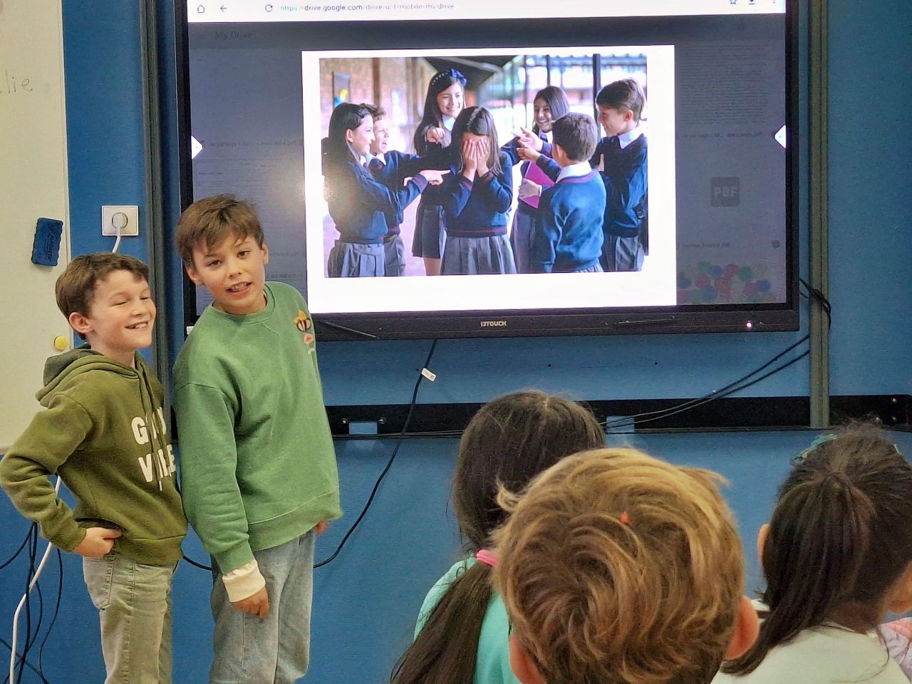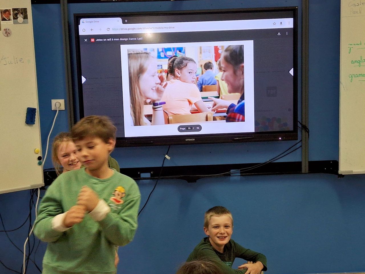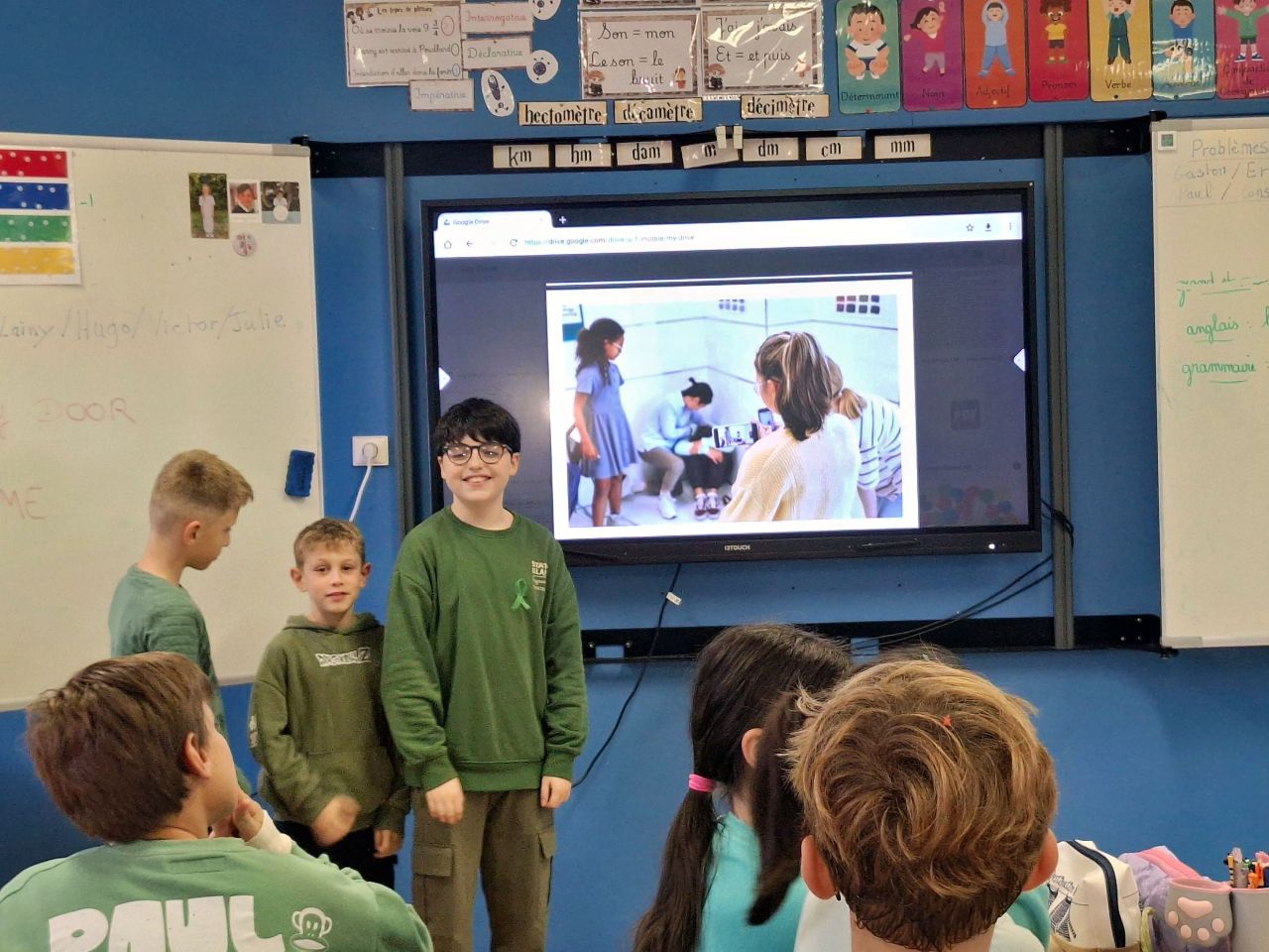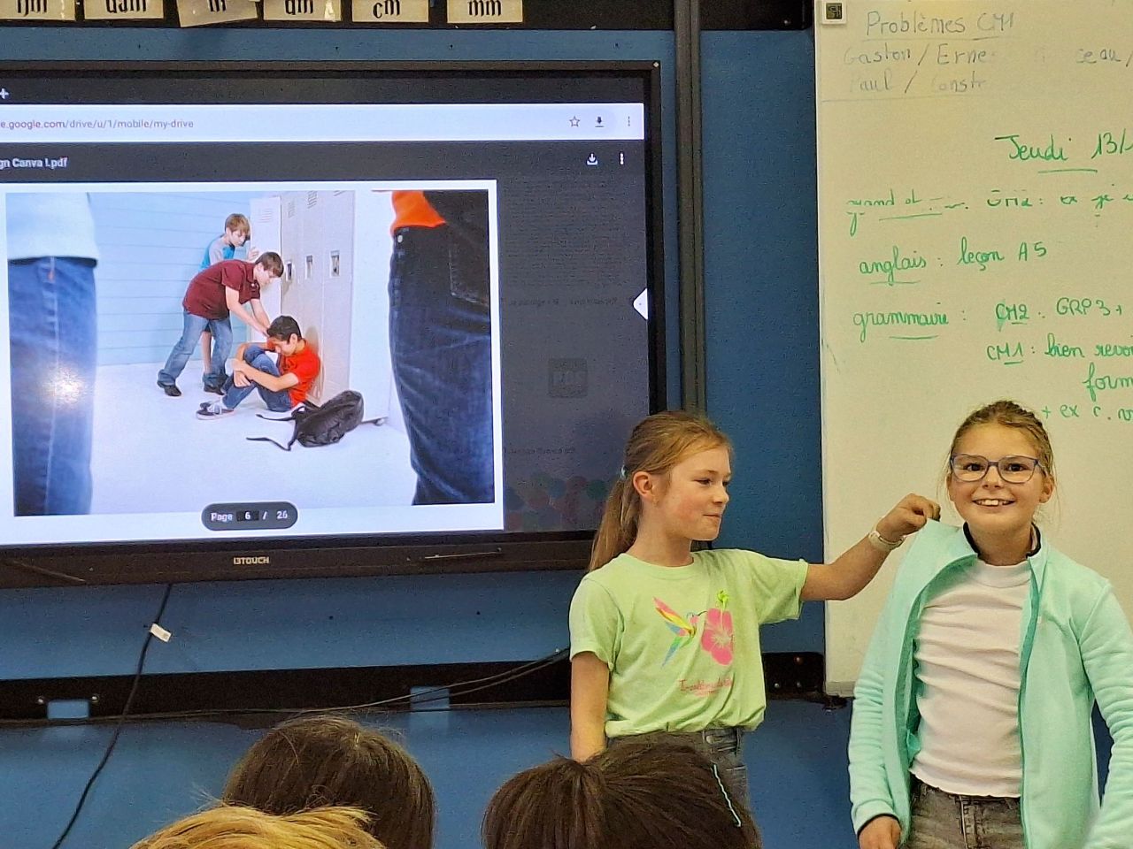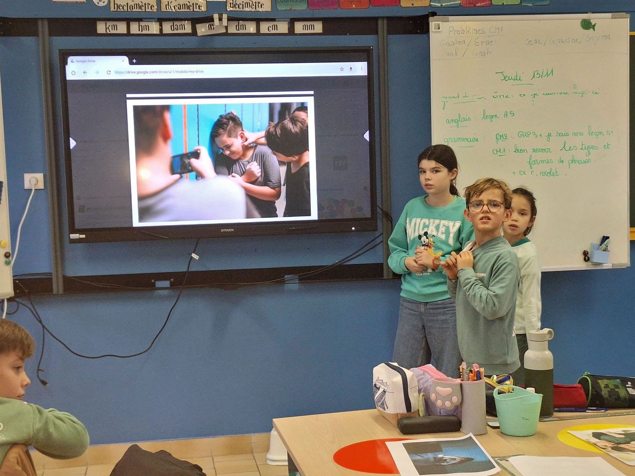 Pour la journée nationale de lutte contre le harcèlement scolaire, notre classe a participé à un webinaire en direct proposé par Milan Éducation, sur le thème des moqueries. Préalablement, les enfants avaient fait un petit travail de réflexion par groupe à partir de l'album "on se moque de moi"