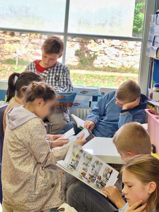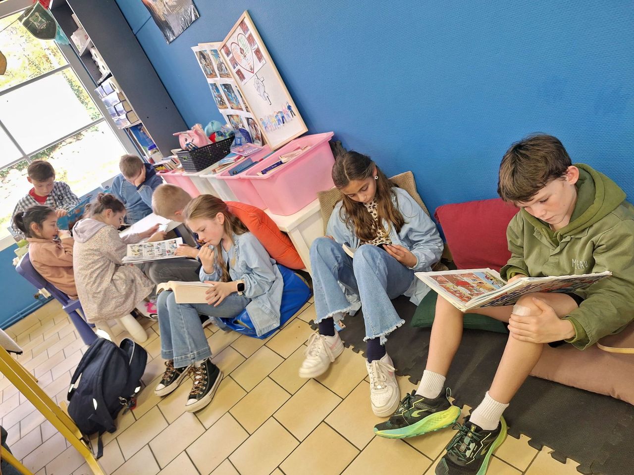Chaque début d'après-midi les cm1 cm2 s'installent confortablement et font le 1/4 d'heure de lecture silencieuse